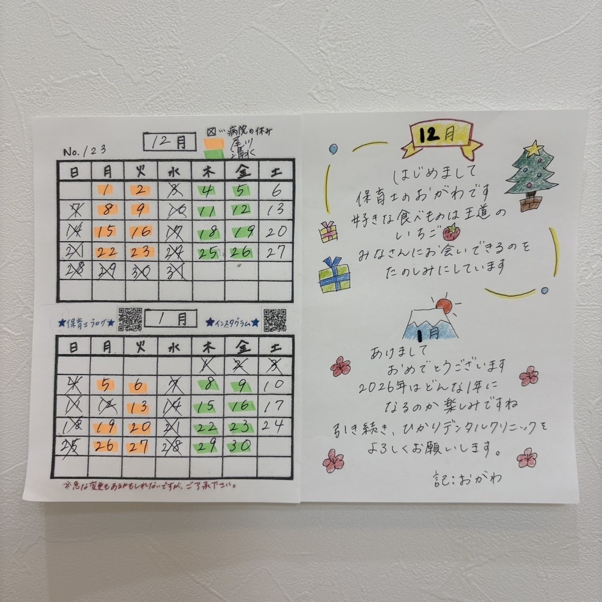 12月・1月の最新託児カレンダーはこちらです
