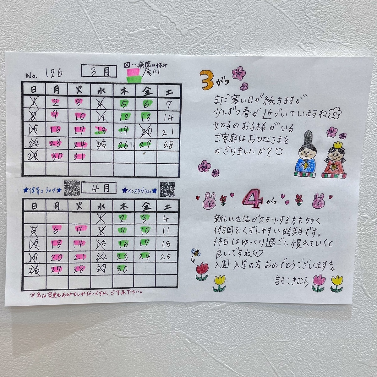 3月・4月の最新託児カレンダーはこちらです